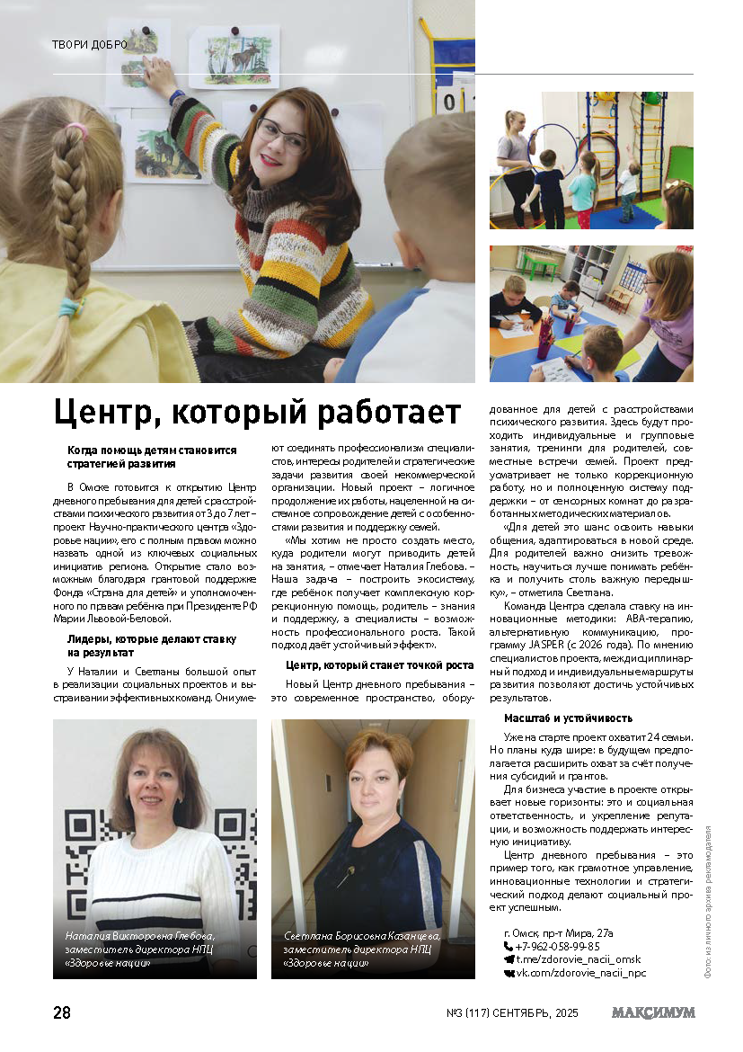 Об уникальных особенностях нашего Центра дневного пребывания рассказали в осеннем выпуске журнала «Максимум»! В проекте Научно-практического центра «Здоровье нации» для детей с расстройствами психического развития создадут современное, оборудованное пространство, в котором пройдут индивидуальные и групповые занятие, тренинги для родителей, совместные встречи семей. Узнайте подробности в статье